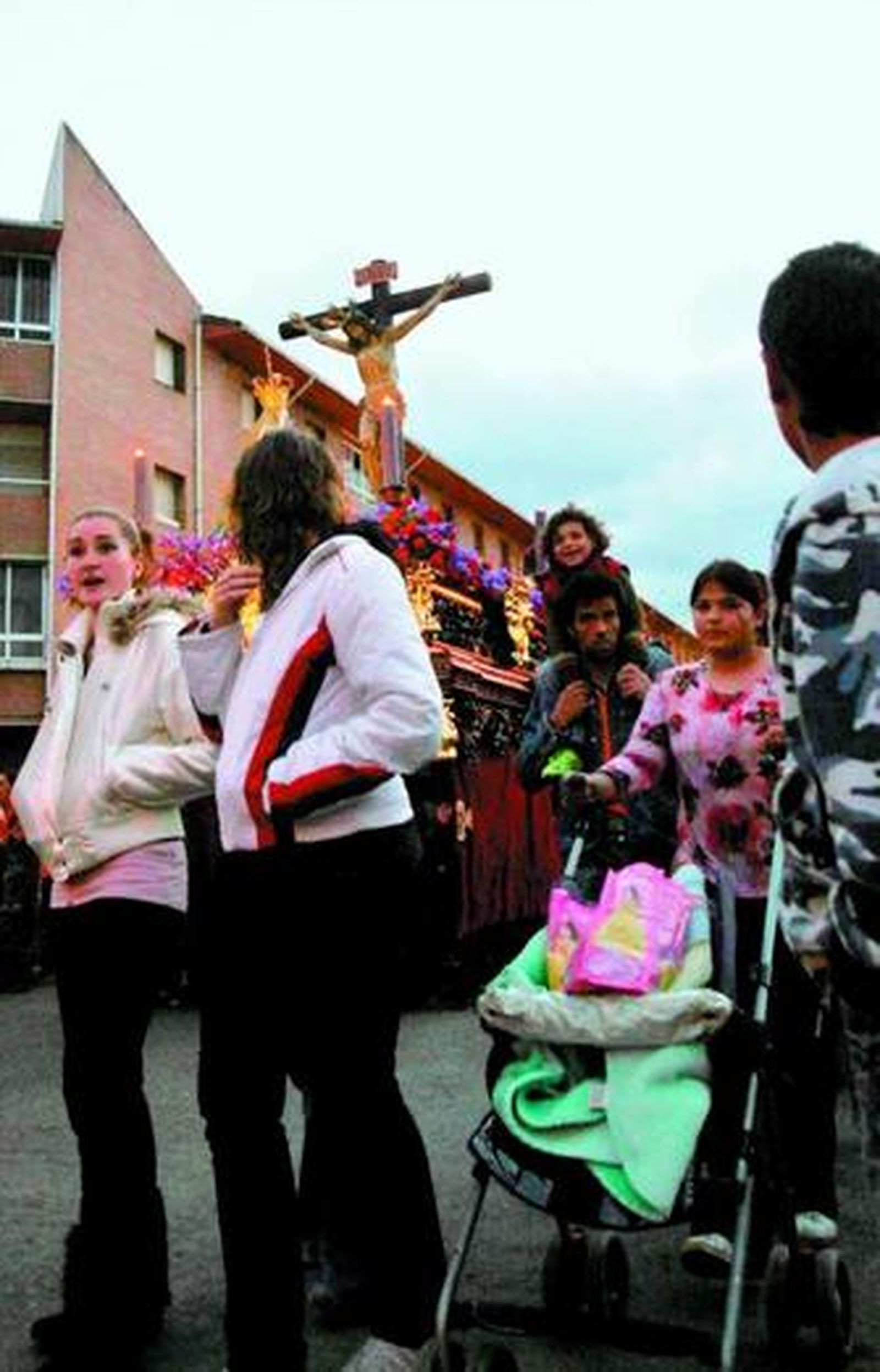 La figura blanca del templo dibuja una extraña estampa cuando el sol que se apaga ilumina las dos hileras de nazarenos contra los muros de ladrillo rojo de los edificios. La comitiva enfila la calle Sierra de Guadarrama en busca de la avenida de Miralbaida, acompañada por el bullicio de chiquillos que corretean y que quieren ser costaleros como sus hermanos mayores. Algunos juegan a seguir el movimiento de los incensarios y otros se pegan a las faldas de los nazarenos.