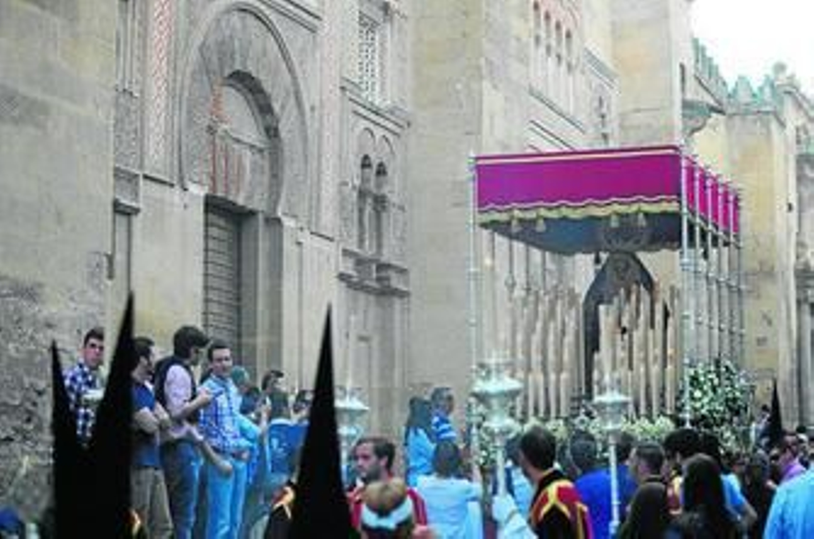 Los alrededores de la iglesia de San Roque bullían de gente casi una hora antes de la salida del Perdón mientras los abuelos del Buen Pastor esperaban sentados en los laterales del pórtico. Había que coger sitio para ver una de las salidas más especiales de la Semana Santa cordobesa. En un pequeño ensanche en la estrechez de la calle Buen Pastor aparece el templo. Parece imposible que un paso de las medidas del Misterio del Perdón pueda salir por esa puerta, que el palio de la Virgen pueda pasar sin que los varales rocen la fría piedra. Pero cada Miércoles Santo -si la lluvia lo permite- se obra el milagro y por ese pequeño vano aparecen las bellas imágenes de esta cofradía.
