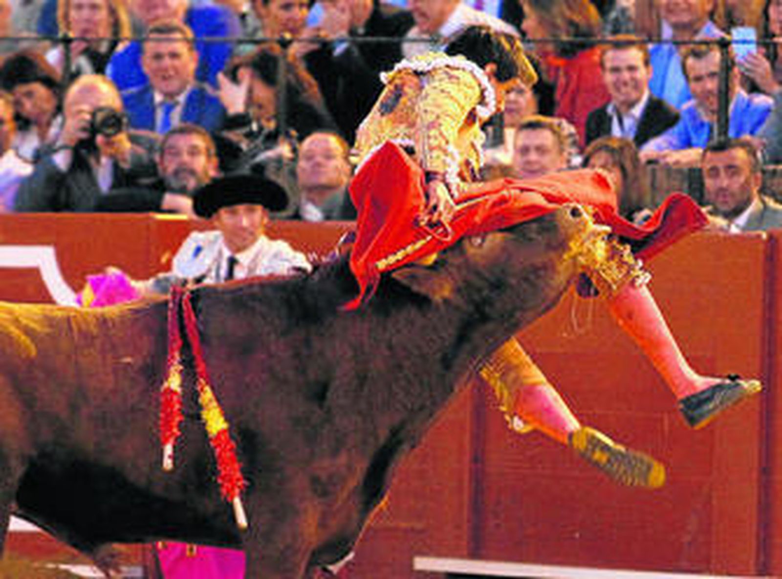 El jovencísimo diestro limeño -tiene únicamente 19 años- se empleó a fondo ante el colorao sexto, que salió con pies y al que cuidaron en varas. El toro se vino abajo pronto. Pero el peruano, muy decidido, se pasó muy cerca los pitones en muletazos por alto, intercalando pases por la espalda como recurso. Expuso entre los pitones en un epílogo en cercanías. En un abrir y cerrar de ojos, el toro le empaló entre las piernas. Fueron segundos eternos. De lejos y ya de noche, se temía lo peor y se escuchaban gritos de espanto. Afortunadamente, todo quedó en un susto y tras un pinchazo y estocada dio una vuelta al ruedo.