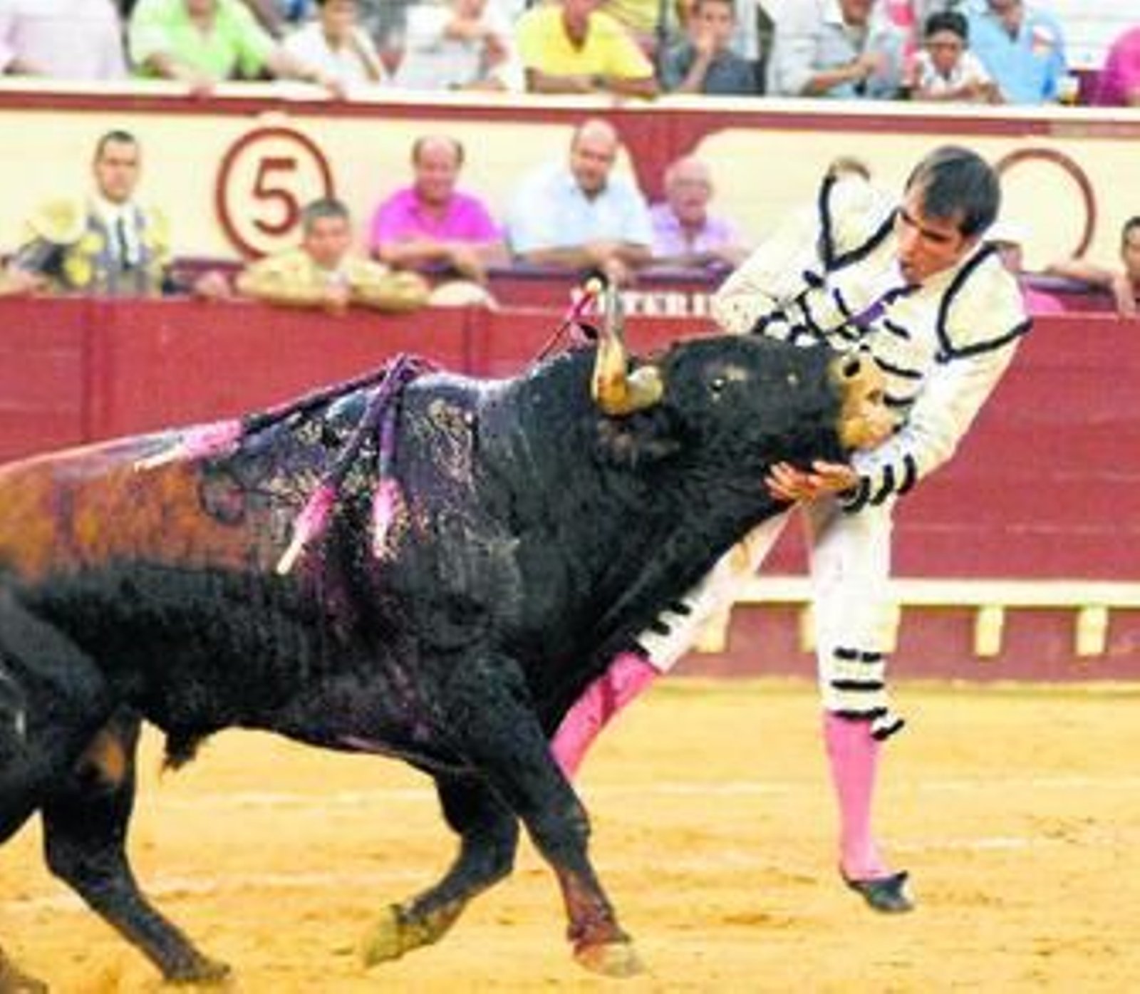 Macías se tiró a matar sin salirse de la suerte al quinto toro de la corrida, segundo de su lote, de la ganadería de Buenavista, que le prendió a la altura del pecho, le levantó del suelo y le zarandeó unos segundos en el aire.